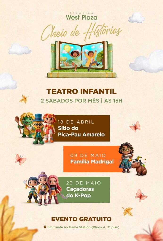 No dia 18 de abril, estreia um novo projeto cultural voltado às famílias: o “West Plaza: Cheio de História”, com apresentações gratuitas de teatro infantil. Nesse sábado, data em que se celebra o Dia Nacional do Livro Infantil e o Dia de Monteiro Lobato, a peça será o clássico Sítio do Picapau Amarelo, inspirando crianças e adultos a revisitarem personagens que marcaram gerações. Além do teatro, o shopping oferece outras opções de lazer para completar o passeio em família, como cinema, boliche e diversas operações de entretenimento e gastronomia.