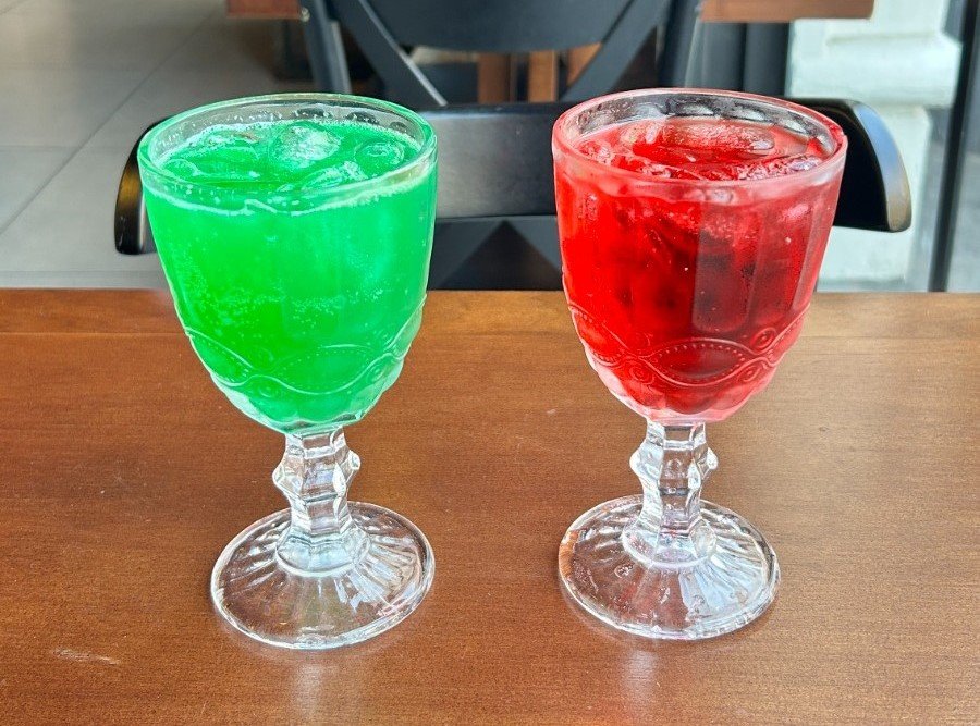 Poções encantadas: À escolha do cliente, a poção que acompanha o combo pode ser a Rubra, feita com o sabor intenso do xarope de morango e água gaseificada, ou a Verdejante, mistura cítrica e refrescante de suco de laranja, limão-siciliano e água gaseificada.